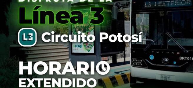 Como parte de la política que impulsa una movilidad sin límites el Gobierno del Estado de San Luis Potosí amplió el horario de operación de la Línea 3 de MetroRed – Circuito Potosí, que ahora ofrecerá servicio hasta las 22:00 horas, facilitando el traslado seguro de personas que acuden o laboran en diferentes zonas comerciales como plaza San Luis, The Park, entre otras.