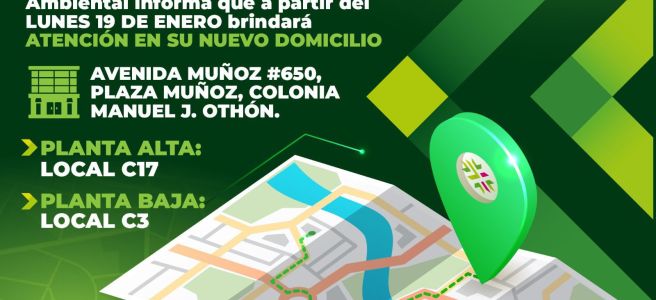 La Secretaría de Ecología y Gestión Ambiental (Segam) iniciará operaciones en nuevas oficinas a partir del 19 de enero, ubicadas en Plaza Muñoz, sobre Avenida Muñoz número 650, en la colonia Manuel J. Othón, dentro de su horario habitual.