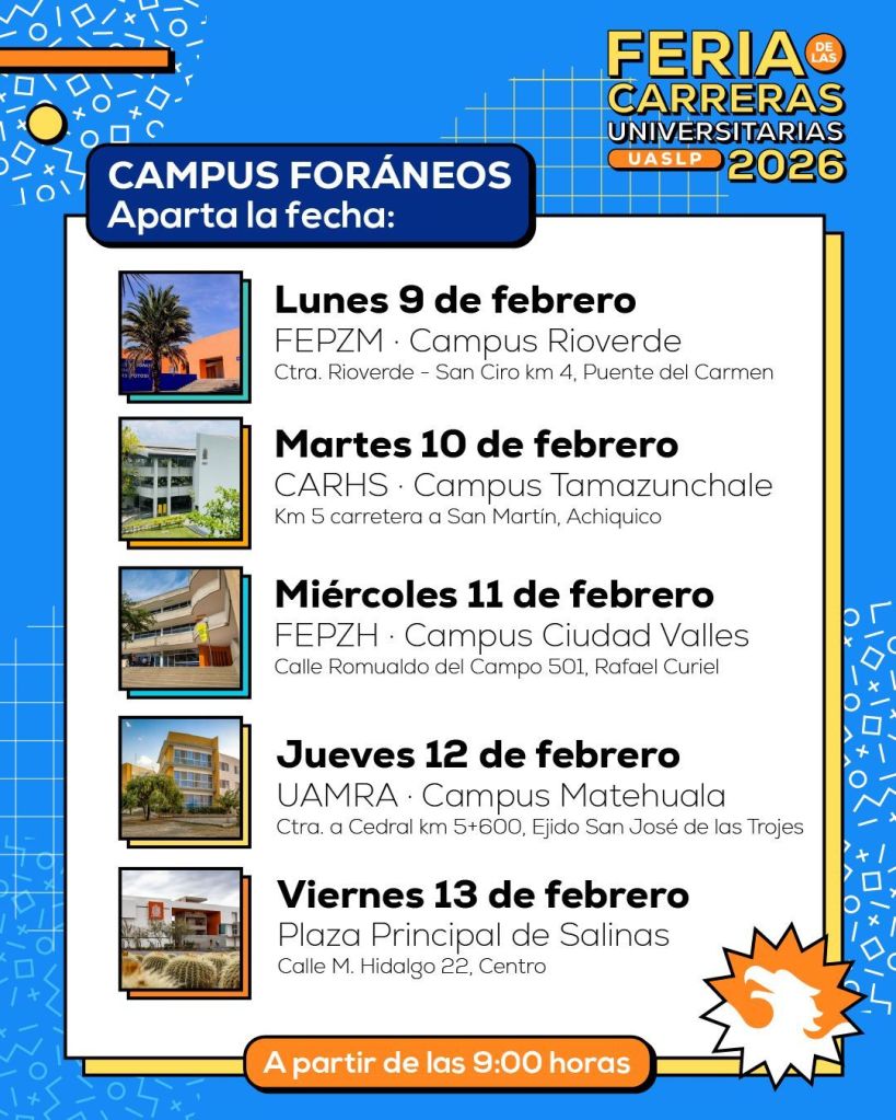 La Universidad Autónoma de San Luis Potosí (UASLP) llevará a cabo la Feria de las Carreras 2026 del 9 al 21 de febrero en los distintos campus del estado, así como en la capital potosina, para acercar a los jóvenes aspirantes a la oferta de educación superior de la institución, a partir de las 09:00 horas, con entrada gratuita.