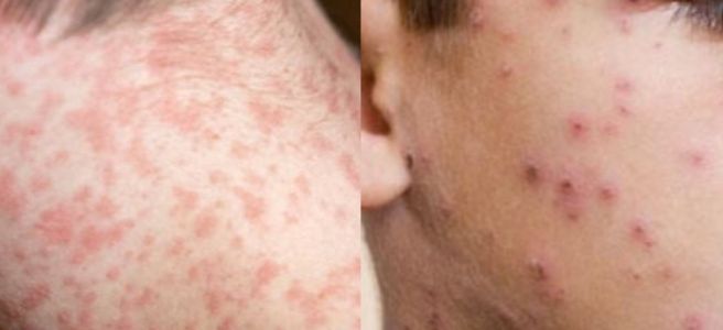 En el caso del sarampión, las manchas rojas son más pequeñas, no presentan ampollas y se distribuyen de manera más uniforme, acompañadas generalmente de fiebre elevada y síntomas respiratorios como la tos.