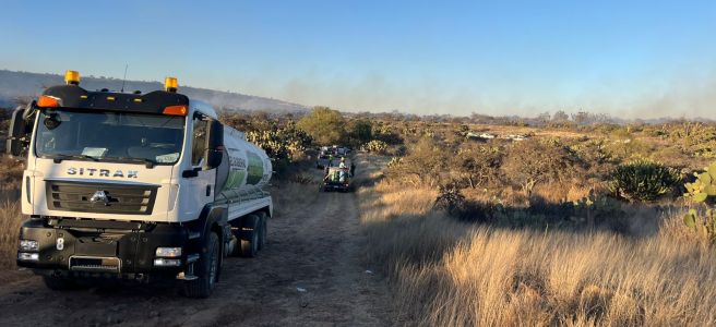 La Comisión Estatal del Agua (CEA) se sumó a las labores de combate a los incendios en Mexquitic de Carmona, aportando tres camiones cisterna de 20 mil litros cada uno para reforzar la atención a la contingencia, como parte del cambio que se vive y se siente con un trabajo sin límites por la protección del entorno natural y de las familias.