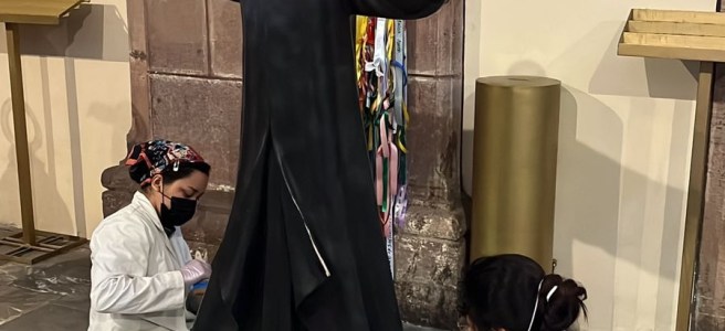 ESTUDIANTES DE LA UASLP E INAH REALIZAN LIMPIEZA DE IMÁGENES DE TEMPLO DE LA COMPAÑÍA, TRAS DAÑOS DEL 8M