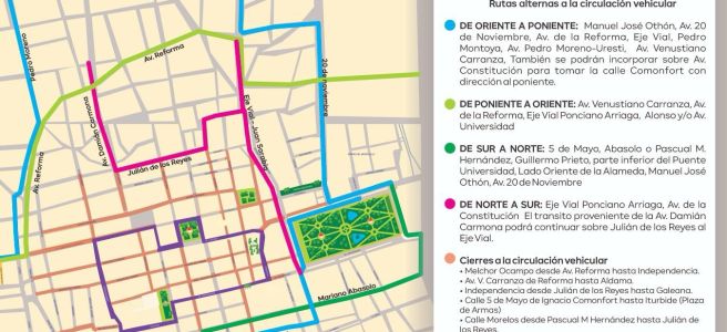 En dirección de poniente a oriente, oficiales de Policía Vial estarán canalizando la circulación vehicular por la avenida Venustiano Carranza; también sobre Reforma, Eje Vial hacia la calle Alonso y/o avenida Universidad.
