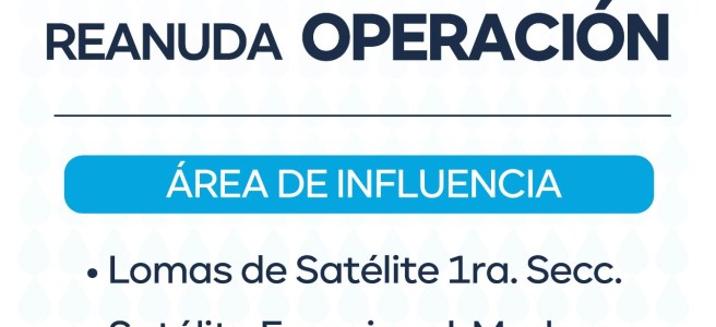 Con estas acciones, el suministro de agua por red comenzará a restablecerse de manera gradual en las colonias Nueva Progreso, Lomas de Satélite 1ª sección y Satélite Francisco I. Madero.