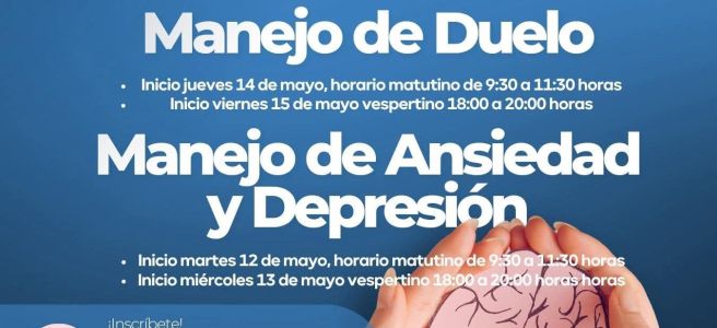 Manejo de Ansiedad y Depresión: inicia el martes 12 de mayo, de 9:30 a 11:30 horas y el miércoles 13 de mayo, de 18:00 a 20:00 horas.
