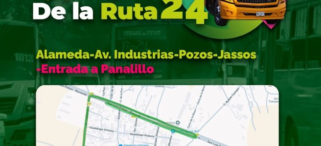La Secretaría de Comunicaciones y Transportes (SCT) anunció la nueva Ruta 24 del transporte público concesionado Alameda – Avenida Industrias – Pozos – Jassos, con entrada a Panalillo, la cual ya se encuentra disponible en Google Maps como parte de la estrategia de modernización del transporte público.