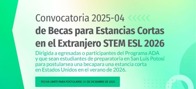 El Consejo Potosino de Ciencia y Tecnología (Copocyt) lanzó la Convocatoria 2025-04 de Becas para estancias cortas en el extranjero “STEM ESL Program for High School Students 2026”, dirigida a estudiantes mujeres de preparatoria participantes o egresadas de ADA, Programa de fortalecimiento en STEM+. Esta iniciativa busca ofrecer experiencias de aprendizaje internacional que amplíen las … Sigue leyendo IMPULSO A ESTUDIANTES POTOSINAS PARA VIVIR EXPERIENCIAS INTERNACIONALES