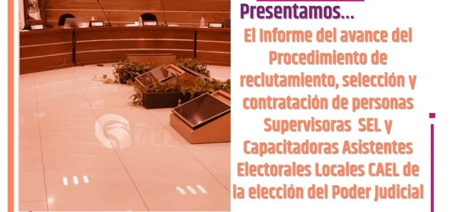 El Consejo Estatal Electoral y de Participación Ciudadana (CEEPAC) presentó el informe de avance del procedimiento de reclutamiento, selección y contratación de personas Supervisoras Electorales Locales (SEL) y Capacitadoras Asistentes Electorales (CAEL) para la elección de personas juzgadoras del Poder Judicial del Estado de San Luis Potosí. Se informó que el 28 de abril, 30 … Sigue leyendo INFORMA CEEPAC SOBRE RECLUTAMIENTO DE PERSONAS SUPERVISORAS Y CAPACITADORAS PARA PROCESO ELECTORAL EXTRAORDINARIO