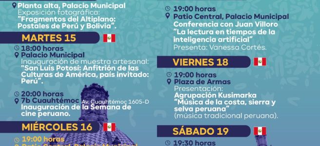 San Luis Potosí, Capital Americana de la Cultura 2025, recibe en julio al hermano país de Perú, quienes ofrecerán una probada de su muestra gastronómica y artesanal, además de un interesante intercambio artístico en Plaza de Armas y dentro del Centro Cultural Palacio Municipal.Así lo dio a conocer Héctor Ulises Tello Balderas, responsable de Cultura … Sigue leyendo AHORA TOCA A PERÚ PAÍS QUE PRESENTE EN SLP CAPITAL AMERICANA DE LA CULTURA