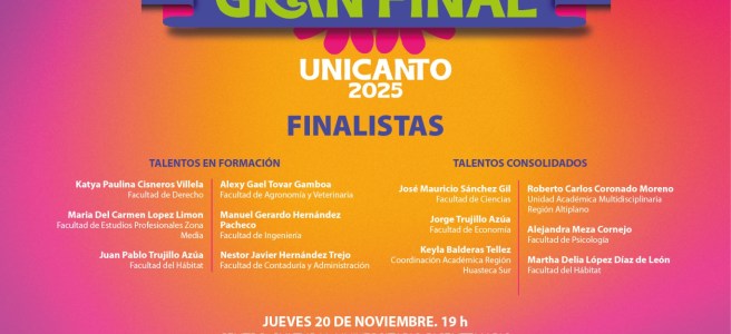 La Universidad Autónoma de San Luis Potosí, a través de la Secretaría de Difusión Cultural, invita a la Gran Final de Unicanto 2025, que se llevará a cabo el jueves 20 de noviembre a las 19:00 h en el Centro Cultural Universitario Bicentenario.Será una noche especial en la que los 12 finalistas rendirán homenaje al … Sigue leyendo UNICANTO 2025 DE LA UASLP LLEGA A SU FINAL